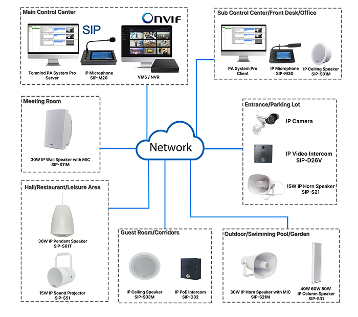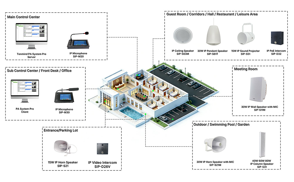 Hotels are complex environments that require clear communication, background music, emergency broadcasting, and operational paging across large and varied spaces — from lobbies and guest corridors to restaurants, conference halls, and outdoor areas. Unlike legacy analog systems, network-based IP Speaker and PA System solutions provide flexible control, digital quality audio, zoning, and remote system management.