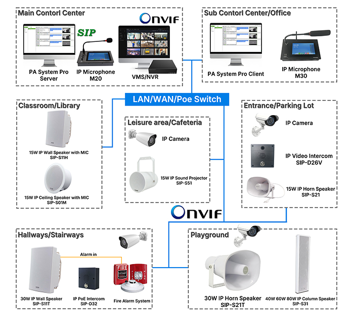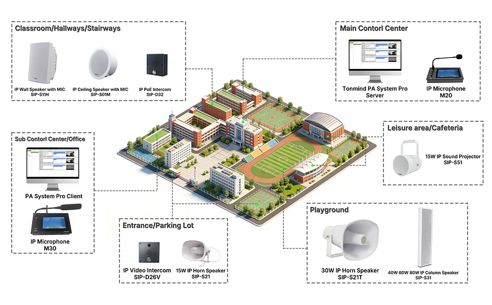 TONMIND’s IP Speaker & PA System brings modern, intelligent audio communication to education campuses. By combining IP-based architecture, SIP communication, ONVIF security integration, and centralized PA control, schools can significantly improve safety, operational efficiency, and daily communication.