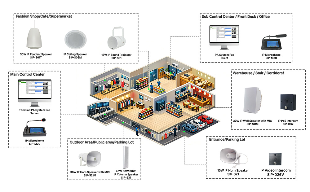 The TONMIND Smart Retail Solution integrates IP Speaker and PA System technologies with security, emergency broadcasting, and daily operation tools, helping retailers create safer, smarter, and more engaging shopping environments.
