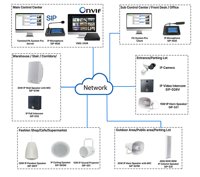 The TONMIND Smart Retail public address Solution delivers a future-ready platform that combines IP Speaker technology, PA System reliability, SIP public address, and ONVIF-based security integration.