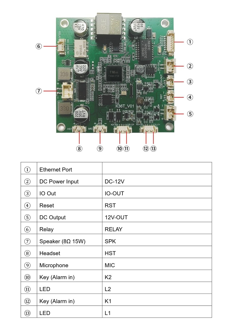The Tonmind SIP PCB Board SIP‑K36T is a highly integrated SIP intercom core module supporting two‑way voice communication. It complies with SIP, ONVIF, HTTP and other network protocols, compatible with VoIP devices and ONVIF VMS. It features a 15W amplifier, rich audio codecs, pre‑recorded message and scheduled playback. It supports alarm input, IO output, relay control and HTTP URL trigger for flexible linkage. Power supply options include PoE and DC 12V. It integrates MIC, speaker and audio interfaces, supports web configuration and firmware upgrade, widely used in intercom, door phone and public address systems.
