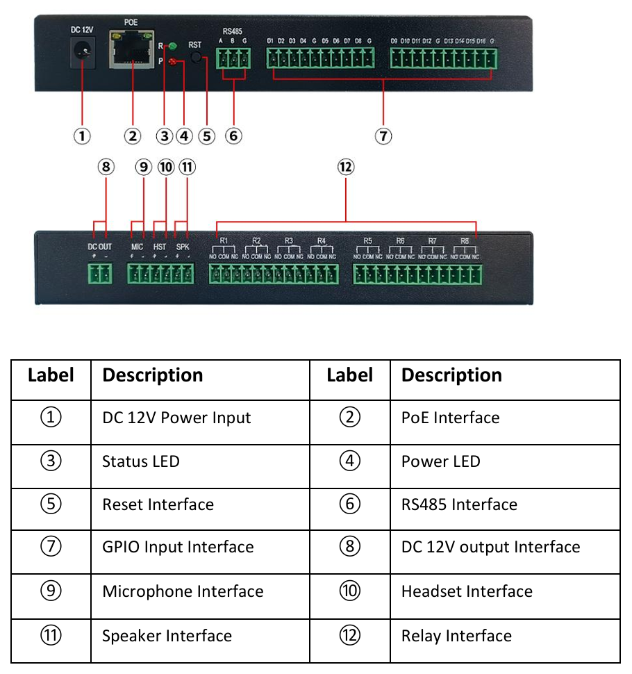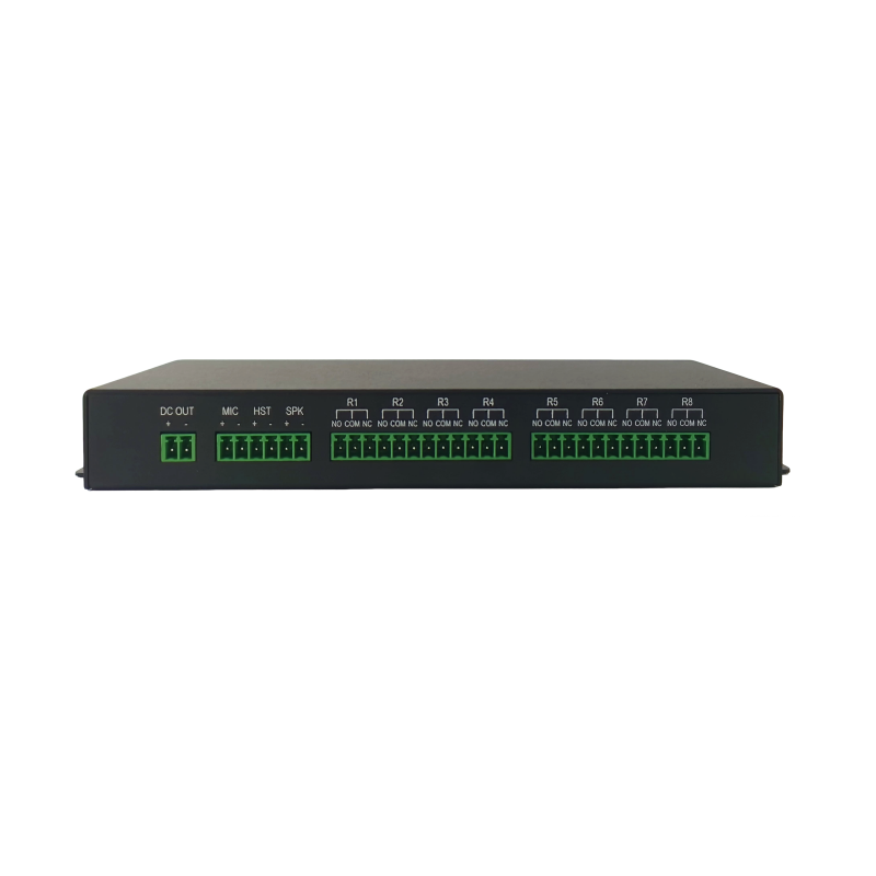 1 × MIC input, 1 × Headset output, 1 × Speaker output, 8 × Relay, 16 × GPIO Alarm input, 1 × DC output, 1 × RS485, 1 × Reset |